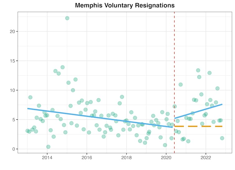 We monitor police staffing levels in several agencies across the U.S. In one large, Western police department, we found that in the seven months following the Floyd protests, voluntary resignations of sworn officers were nearly three times (279%) higher than baseline expectations.