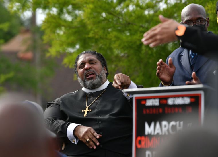 Reverend Barber speaks during a protest after the killing of Andrew Brown Jr. demanding the release of the body camera videos the day before the funeral in Elizabeth City on May 2.