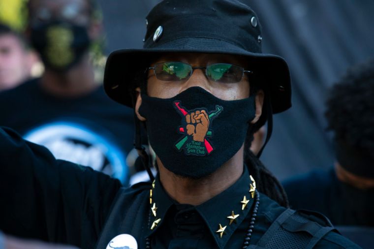 “We know that political power doesn’t flow from the sleeve of a dashiki. We know that political power flows from the barrel of a gun.” Pictured: A demonstrator wears a facemask with a patch reading Fred Hampton Gun Club during a protest against police brutality and racism at Lafayette Square near the White House in Washington, D.C., on June 7, 2020.