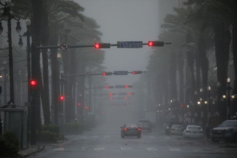 Motorists drive down Canal Street as Hurricane Ida makes landfall in New Orleans, on Aug. 29, 2021.