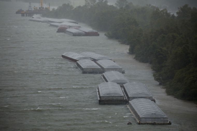 Barges docked on the Mississippi River as Hurricane Ida makes landfall in Destrehan, Louisiana, on Aug. 29, 2021.