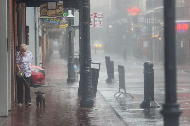 A woman walks her dog in the French Quarter during Hurricane Ida on August 29, 2021 in New Orleans, Louisiana.