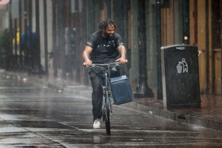 A worker rides a bicycle to deliver food in the French Quarter during Hurricane Ida on August 29, 2021 in New Orleans.