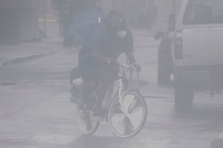 A cyclist wears a face mask as they ride through rain and high winds on Canal Street in New Orleans on August 29, 2021 during Hurricane Ida.