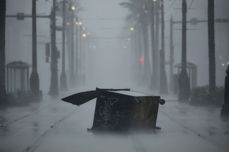 A dumpster is tossed by gusting winds along Canal Street during Hurricane Ida in New Orleans on Sunday, Aug. 29, 2021.