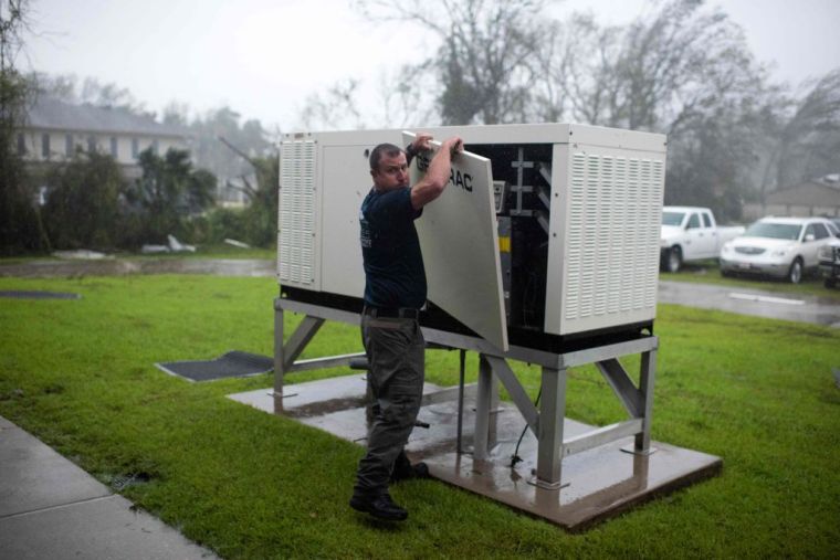 Bourg fire chief TJ Pellegrin takes off the generator door to get it back started up after natural gas lines were turned off in Bourg, Louisiana as Hurricane Ida passes on August 29, 2021.