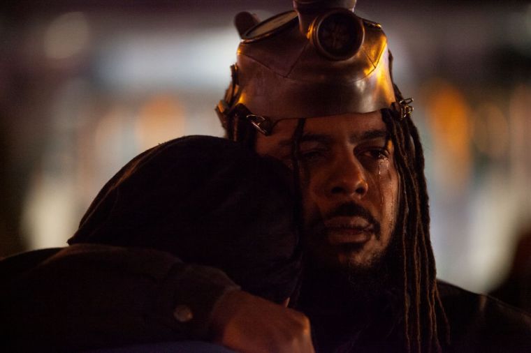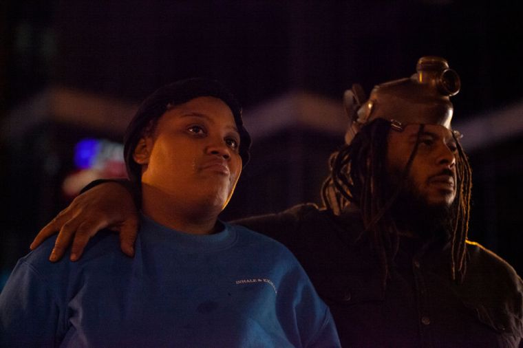 Dejuan Sharp comforts Blue Patterson, both of the Downtownerz, as they stand in front of the Ohio Statehouse after police killed Ma’Khia Bryant.
