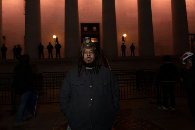 Dejuan Sharp, a member of a local BLM group, the Downtownerz, stands in front of the Ohio Statehouse in Columbus.
