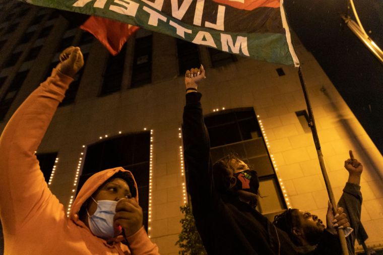Black Lives Matter activists raise their fists outside of Columbus Police headquarters.