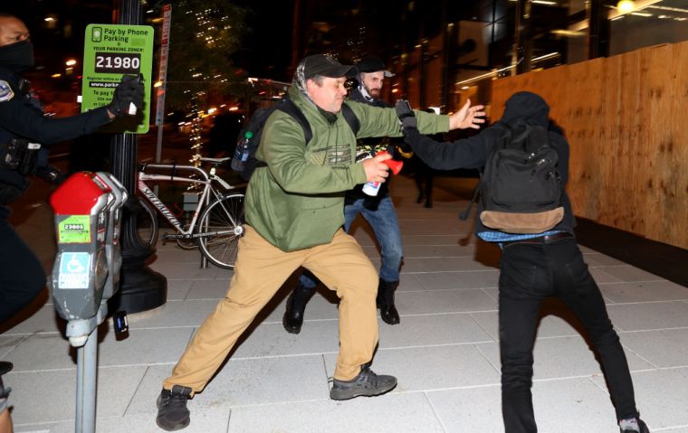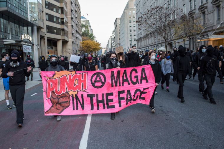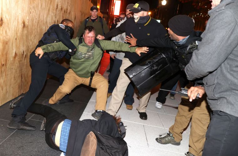 Members of Antifa and Proud Boys clash in the middle of the street following the “Million MAGA March.”