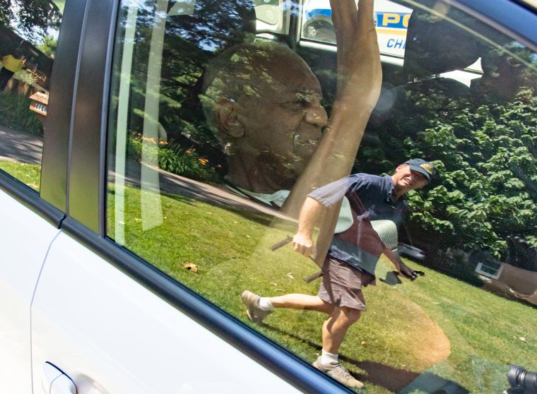 16. Photographers and TV crews close in on Bill Cosby's car as h