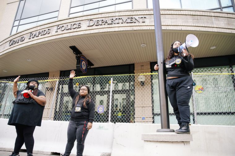 GRAND RAPIDS, MICHIGAN – APRIL 14: People gather during a BLM protest march, in Grand Rapids, Michigan, United States on April 14, 2022. Protesters stop in front of the Downtown police headquarters.