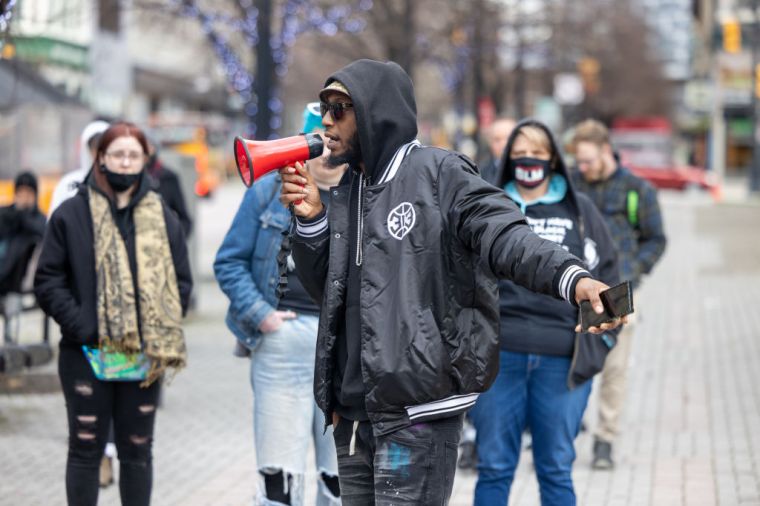 GRAND RAPIDS, MICHIGAN – APRIL 14: People gather during a BLM protest march, in Grand Rapids, Michigan, United States on April 14, 2022. A young man starts to speak as the rally begins and people are gathering downtown at a park appropriately named Rosa Parks Circle.